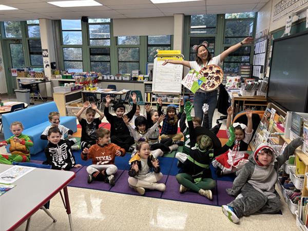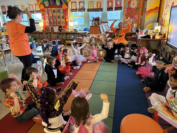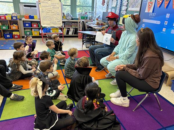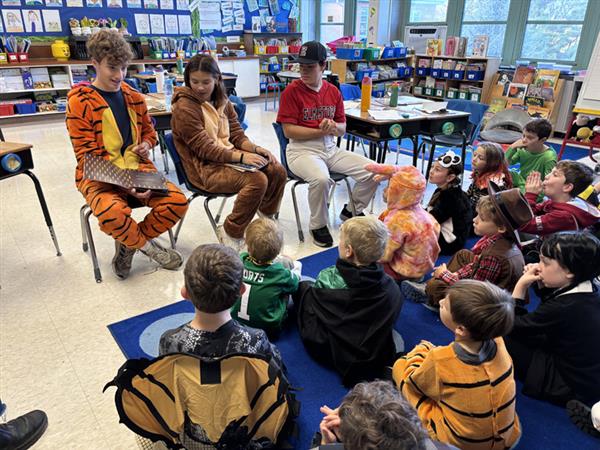 Dows Lane Elementary students and Irvington High School seniors came together to celebrate Halloween and Green/White Spirit Day with a festive parade, classroom read-alouds and a special musical performance.